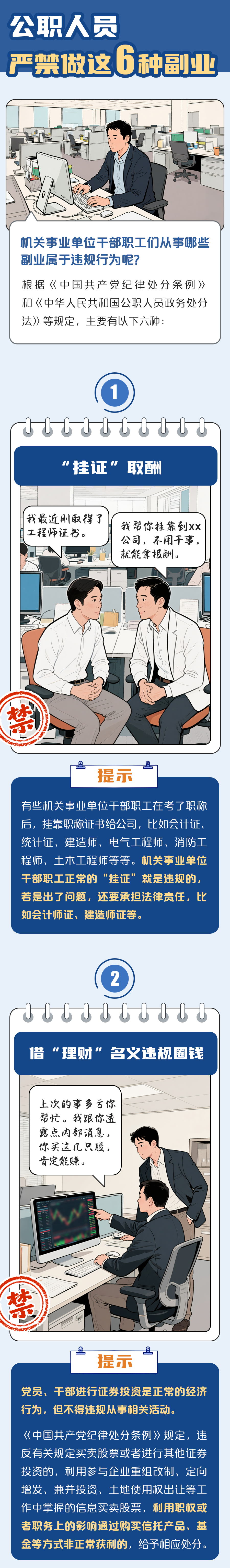 总体来看,有6类情形需特别注意,包括“挂证”取酬、借“理财”名义违规圈钱、违规从事有偿中介活动、违规兼职、揽私活和其他违反有关规定从事营利活动的行为。