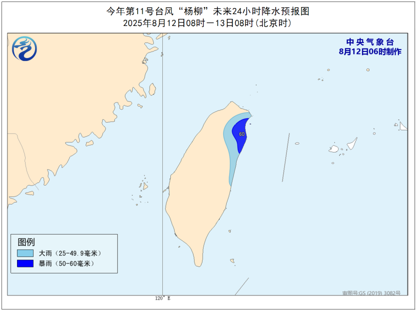 降水预报:8月12日8时至13日8时,台湾岛东北部地区将有大到暴雨(50至60毫米)。